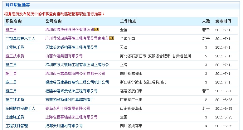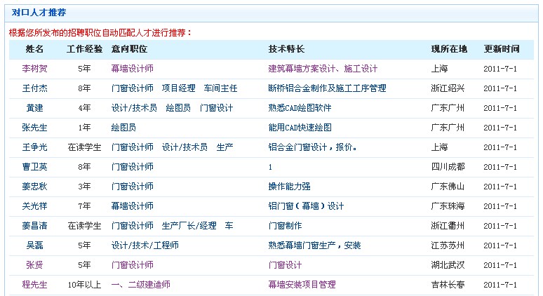 7月1日,門窗幕墻英才網又開發完畢兩個新功能:“對口職位推薦”與“對口人才推薦”。