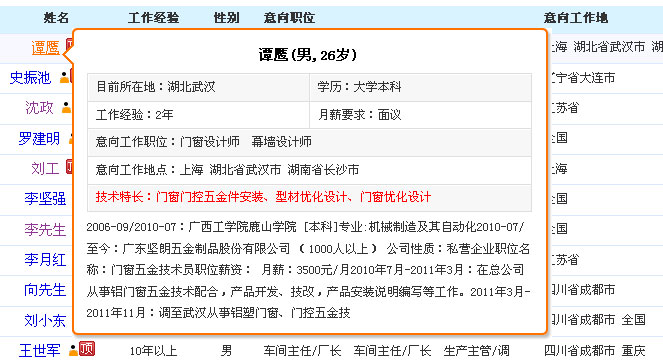 2、在“會員求職”頁面,同樣將鼠標放到人才姓名之上就會彈出該人的簡略介紹,這樣是不是看起來很酷?