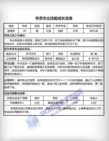 騰訊課堂:三恩方門窗幕墻設計培訓 ●分類課程: 通用課程:門窗幕墻設計基礎(24節課;均時42分鐘/節;總時17小時) 為“門窗、幕墻及預算”專業的通用基礎課程。包含:建筑識圖、編碼手冊、制圖標準、制圖強化及設計標準化等。 一:門窗設計(至少80節課;均時45分鐘/節) 不分等級課程,一課到頂,陸續添加交流互動課(解決學員實踐中遇到的“疑難雜癥”),與時俱進,實時更新課程。 課程涵蓋:門窗幕墻設計基礎、門窗產品概述、方案及施工下料設計、經典案例解析等等。 1.常規門窗(幕墻)工程的方案及施工設計,涉及到的各類標準文本的修改和起草,方案、施工及加工圖表的編制、材料優化等設計操作,步驟清晰、環環相扣、完整無遺漏; 2.各類塑鋼、金屬門窗設計、五金選材及加工下單。產品類別:常規門窗、電動開啟的提拉窗、中懸窗等等。 3.結合國內外先進技術的門窗系統,在型材、五金及輔材上逐項剖析,使學員能博取眾長,根據開發商及建筑功能需要,獨立設計和開發門窗系統(針對單一建筑的系統設計是行業趨勢)。經典案例:鋼鋁復合門、幕墻窗、德國斜屋面系統窗等。由具有數十項新型專利設計經驗的講師擔綱; 二:1.幕墻設計(成才級)(至少120節課;均時45分鐘/節) 常規幕墻:玻璃、石材及金屬板材幕墻、各類雨蓬、采購單、欄板的方案及施工下料設計。 課程涵蓋:幕墻設計基礎、產品概述、各類疑難三維下料設計、經典案例解析等等。 1)基礎理論:其課時只占比重不足15%,側重難點講解,配三級目錄檢索的電子版精簡理論集合,便于實踐中隨時查閱。內容囊括:行業規范、材料性能及表面處理,以及主輔材料選配和應用等等; 2)設計操作 :常規幕墻工程的方案及施工設計,涉及到的各類標準文本的修改和起草,方案、施工及加工圖表的編制、材料優化等設計操作,步驟清晰、環環相扣、完整無遺漏; 3) 授課內容:常規(玻璃、石材、金屬)建筑幕墻,包含各類點式、明隱框、半單元式玻璃幕墻,石材、鋁單板、陶土板的框架和單元做法,雨篷、天窗、欄板、格柵及各種異形采光頂。 4)案例實踐:以樣板工程為例,按效果圖、建筑藍圖及技術要求,學員能夠獨立、定時完成各階段設計內容,遇到問題,講師逐一講解; 2.幕墻設計(精英級)(至少40節課;均時45分鐘/節) 課程主要剖析各類復雜幕墻的系統設計。以德國gmp在北京的一個多功能單元體項目為例,其系統難度和成熟度國內獨有,與單元主體銜接的層間裝飾帶、懸挑鋼結構造型、室內窗簾盒及導軌、窗臺板等均為單元系統結構,根據主體結構變化,系統隨之改變,立面轉角及圓弧,任何一處不摻雜框架結構。參照之中細節做各類幕墻系統設計,難題迎刃而解。課程由此項目主任設計師擔綱主講。 三:門窗幕墻預算(至少20節課;均時45分鐘/節) 利用Excel表格,課程達到學員獨立完成各類門窗幕墻產品的成本核算和報價。高效的預算模板,精確到實際“加工級”。 專業基礎強化輔助課程:穿插在以上各級課程內,對提高工作效率、規避錯單、養成良好的設計習慣、打下扎實的專業基礎至關重要: 1、3N方設計標準化:借鑒多位技術精英在遠大等**企業從業經驗,經大量的工程設計實踐整編而成,覆蓋各類文本、表格及齊備的作圖功能塊; 2、制圖強化:因專業差異或基礎較差,進行的CAD二維和三維制圖訓練,以提高作圖效率和圖文表達能力; 3、參照3N方幕墻資料的檢索程序,迅速找到文件包內對應的參考資料和案例; 4、結合眾多工程技術難點和盲點,參照大量圖片、圖紙、視頻和三維動畫,舉一反三,培養學員獨立思考,用邏輯思維提高設計及創新能力。 5、定期組織去工地現場、加工車間做實地直觀講解,規避經驗短板,理論和實踐有效銜接; 6、技術溝通能力:與部門間、工程現場、開發商及設計院所有效溝通的方法和規則,有效駕馭和規避職場風險,提高技術溝通能力。 與培訓行業的浮躁、急功近利不同,三恩方注重的是專業的基礎素質教育,經過扎實的專業基礎和高精尖的專業課程,較終把學員打造成“三位一體”的、專業綜合素質在職場具有競爭力的未來精英。 |