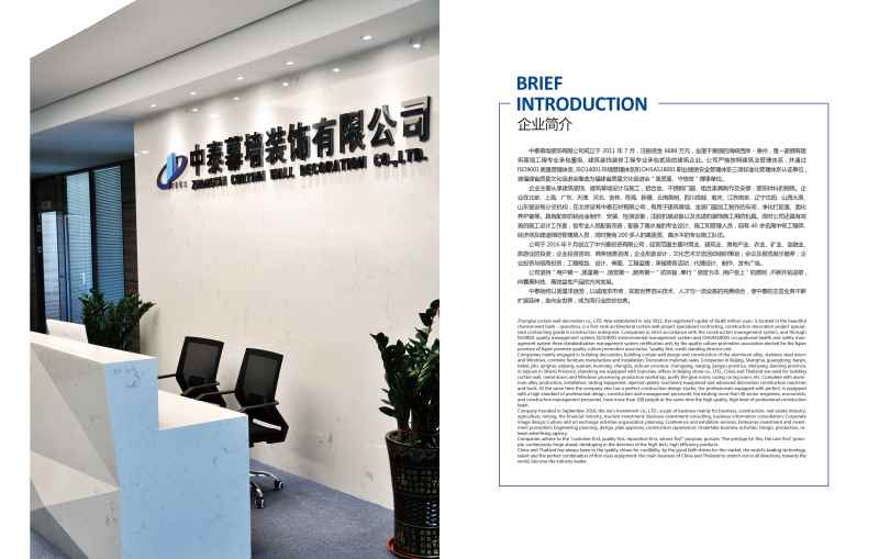中泰幕墻裝飾有限公司成立于2011年7月,注冊資金6688萬元,坐落于美麗的海峽西岸·泉州,是一家擁有建筑幕墻工程專業承包壹級、建筑裝飾裝修工程專業承包貳級的建筑企業。公司嚴格按照建筑業管理體系,并通過ISO9001質量管理體系、ISO14001環境管理體系和OHSAS18001職業健康安全管理體系三項標準化管理體系認證單位,被福建省質量文化促進會推選為福建省質量文化促進會“重質量、守信譽”理事單位。 企業主要從事建筑裝飾、建筑幕墻設計與施工,鋁合金、不銹鋼門窗、組合家具制作及安裝;裝飾材料的銷售,企業在北京、上海、廣東、天津、河北、吉林、青海、新疆、云南昆明、四川成都、重慶、江蘇南京、遼寧沈陽、山西太原、山東皆設有分支機構,在北京設有中泰石材有限公司,有用于建筑幕墻、金屬門窗加工制作的車間,凈化打膠室、固化養護室等。具有配套的鋁合金制作、安裝、檢測設備,注膠機械設備以及先進的裝飾施工用的機具。同時公司還具有完善的施工設計工作室,各專業人員配備完善,配備了高水準的專業設計、施工和管理人員,現有40余名高中級工程師、經濟師及建造師的管理層人員,同時擁有200多人的高素質、高水平的專業施工隊伍。 公司于2016年9月創立了中興泰投資有限公司,經營范圍主要對商業、建筑業、房地產業、農業、礦業、金融業、旅游業的投資;企業投資咨詢、商務信息咨詢;企業形象設計;文化藝術交流活動組織策劃;會議及展覽展示服務;企業投資與招商投資;工程規劃、設計、審圖、工程監理;承接商務活動;代理設計、制作、發布廣告。 公司堅持“用戶第一,質量第一,信譽第一,服務第一”的宗旨,奉行“信譽為本,用戶至上”的原則,不斷開拓進取,向著高科技、高效益性產品的方向發展。 中泰始終以質量求信譽,以誠信求市場,實現世界頂尖技術、人才與一流設備的完美結合,使中泰的主營業務不斷擴展延伸,走向全世界,成為同行業的佼佼者。 |