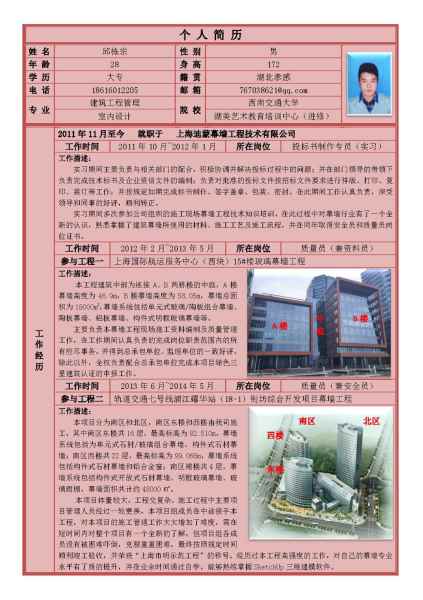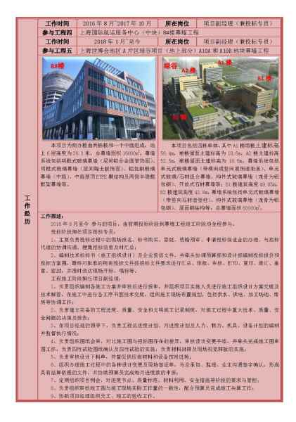 2011年11月至今 就職于 上海迪蒙幕墻工程技術有限公司 工作時間:2011年10月~2012年1月 所在崗位:投標書制作專員(實習) 工作描述: 實習期間主要負責與相關部門的配合,積極協調并解決投標過程中的問題;并在部門領導的帶領下負責完成技術標書及企業資信文件的編制;負責對批準的投標文件按招標文件要求進行排版、打印、復印、裝訂等工作;并按規定如期完成標書制作、簽字蓋章、包裝、密封。在此期間工作認真負責,深受領導和同事的好評,順利轉正。 實習期間多次參加公司組織的施工現場幕墻工程技術知識培訓,在此過程中對幕墻行業有了一個全新的認識,熟悉掌握了建筑幕墻所使用的材料、施工工藝及施工流程,并在同年取得安全員和質量員崗位證書。 工作時間:2012年2月~2013年5月 所在崗位:技術員 參與工程一:上海國際航運服務中心(西塊)15#樓玻璃幕墻工程 工作描述: 本工程建筑中部為連接A、B兩棟樓的中庭,A樓幕墻高度為46.9m,B樓幕墻高度為58.05m,幕墻總面積為18000m2,幕墻系統包括單元式玻璃/陶板組合幕墻、陶板幕墻、鋁板幕墻、構件式明框玻璃幕墻等。 主要負責解決本幕墻工程現場施工難點,參加圖紙會審,對比施工圖與招標圖存在的差異,及時辦理設計變更手續,審核施工圖紙,對于現場安裝難度較大的節點,及時反饋設計師進行深化調整;辦理施工過程中的各種設計變更及現場簽證單,形成具有結算依據的文件,并配合預算員進行價格核算。 工作時間:2013年6月~2014年5月 所在崗位:技術員 參與工程二:軌道交通七號線浦江耀華站(18-1)街坊綜合開發項目幕墻工程 本項目分為南區和北區,南區東樓和西樓由我司施工,其中南區東樓共16層,最高標高為82.510m,幕墻系統包括為單元式石材/玻璃組合幕墻、構件式石材幕墻;南區西樓共22層,最高標高為99.068m,幕墻系統包括構件式石材幕墻和鋁合金窗;南區裙樓共4層,幕墻系統包括構件式開放式石材幕墻、明框玻璃幕墻、玻璃雨棚,幕墻面積共計約48000㎡。 本項目體量較大,工程交復雜,施工過程中主要項目管理人員經過一輪更換,本項目組成員在中途接手本工程,對本項目的施工管理工作大大增加了難度,需在短時間內對整個項目有一個全新的了解,任職期間在主設計師的監督下完成后期的設計變更、拆圖、下料、現場技術指導及竣工圖的編制完善工作,最終按照規定時間順利竣工驗收,并榮獲“上海市明示范工程”的稱號。經歷過本工程高強度的工作,對自己的幕墻專業水平有了質的提升,并在業余時間通過自學,能夠熟練掌握SketchUp三維建模軟件。 工作時間:2014年7月~2015年4月 所在崗位:項目工程師(兼投標專員) 參與工程三:上海國際航運服務中心(東塊)B02樓幕墻工程 本項目建筑高度45.1m,地上10層,幕墻總面積15000m2,幕墻系統包括單元式不銹鋼板/玻璃組合幕墻、構件式玻璃幕墻、雙層全玻璃帶玻璃肋幕墻、采光天窗等。 工作時間:2015年5月~2016年6月 所在崗位:項目工程師(兼投標專員) 參與工程四:中化集團世博B03C-02地塊商辦樓項目幕墻工程 本項目建筑標高74.45m,地上13層,幕墻總面積為25000m2,幕墻系統包括單元式玻璃/石材組合幕墻、構件式玻璃幕墻、采光頂、開放式石材幕墻、鋼結構橫向鋁合金裝飾條、金屬不銹鋼絲網等。本項目獲得上海市建設工程“白玉蘭”獎。 工作描述: 2014年至2016年期間參與的項目,由前期投標階段到幕墻工程竣工階段均全程參與。 投標階段擔任項目投標專員: 1、主要負責投標過程中的現場報名、標書購買、答疑、資格預審、申請投標保證金的辦理、與招標代理的協調溝通、搜集招標信息及時匯總; 2、編制技術標標書(施工組織設計)及企業資信文件,并牽頭協調預算部和設計部編制投標報價和投標方案圖,最終對批準的所有投標文件按招標文件要求進行匯總、排版、審核、打印、復印、裝訂、蓋章、密封,并準時送達現場開標、唱標等。 工程施工階段擔任項目工程師: 1、編制施工組織設計、安全專項方案(并負責組織專家評審)及各分項安全專項方案(腳手架、吊籃、吊裝、臨時用電及各復雜部位安全專項方案等),制定施工過程中的各種安全、質量、成本措施,并監督執行情況; 2、參加圖紙會審,對比施工圖與招標圖存在的差異,及時辦理設計變更手續,審核施工圖紙,對于現場安裝難度較大的節點,及時反饋設計師進行深化調整; 3、辦理施工過程中的各種設計變更及現場簽證單,形成具有結算依據的文件,并配合預算員進行價格核算; 4、運用SketchUp繪制所有幕墻系統三維模型樣板及施工場景三維示意(包括腳手架搭設、吊籃搭設及吊裝設備搭設方式等),以此對現場施工作業人員進行施工工藝、施工措施等技術交底,進行首項、首件、首次施工的示范指導,在施工過程中全程指導; 5、運用SketchUp繪制復雜部位幕墻系統三維節點模型,輔助設計師對復雜幕墻系統更直觀的認識,從而提高單元板塊組裝、型材加工圖的準確性,并參與加工圖繪制及下料工作; 6、負責編寫工程技術總結,收集、整理、編制工程竣工技術資料,參加工程質量等級檢驗評定和工程竣工驗收工作; 7、負責審核竣工圖與施工現場實際工作量的一致性,配合預算員完成竣工決算工作。 工作時間:2016年8月~2017年10月 所在崗位:項目副經理(兼投標專員) 參與工程四:上海國際航運服務中心(中塊)8#樓幕墻工程 本項目為商辦