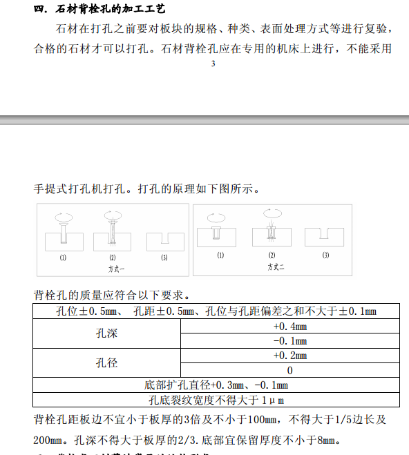 1、石材在打孔之前要對板塊的規格、種類、表面處理方式等進行復驗, 合格的石材才可以打孔。石材背栓孔應在專用的機床上進行,不能采用 4 手提式打孔機打孔。打孔的原理如下圖所示。 背栓孔的質量應符合以下要求。 孔位±0.5mm、 孔距±0.5mm、孔位與孔距偏差之和不大于±0.1mm +0.4mm 孔深 -0.1mm +0.2mm 孔徑 0 底部擴孔直徑+0.3mm、-0.1mm 孔底裂紋寬度不得大于 1μm 背栓孔距板邊不宜小于板厚的3倍及不小于100mm,不得大于1/5邊長及 200mm。孔深不得大于板厚的2/3.底部宜保留厚度不小于8mm。