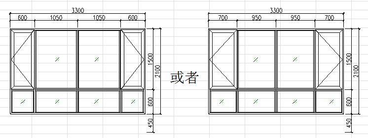 這個窗型分格感覺不太好,如果你能提供更為準確的窗臺高度,則就能知道具體的分格尺寸了。就以你這個來分析吧。如果你的窗臺是435或是450這個高度的分格建議分為600和1500,上面的部分就沒有必要再分成1100和500 了。你的這個窗型,中間分格尺寸太大。面積達到3.57平米了,根據規定:應該使用8mm的原片玻璃,如果你不想使用這個玻璃的話,那么就要控制分格尺寸了。最好是控制在3平米以內。這樣就能使用6mm原片。但是6mm原片,最大只能使用3平米以內的玻璃。或者建議你這樣分格,如我上傳的圖。右邊的分格圖顯示不完整哈。