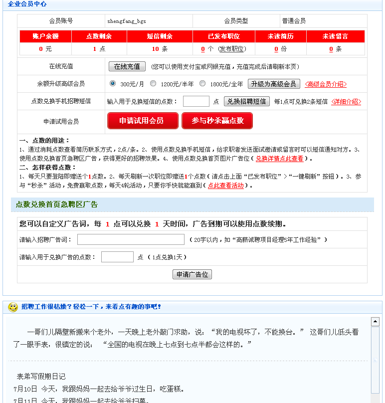今天我們修改了企業和個人的會員管理中心界面,加入了“休閑一刻”模塊,讓用戶在嚴肅的招聘求職工作之余可以看看一些有趣的小故事、小笑話,輕松一下心情。