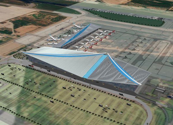 在T4候機樓前,已開始出現縱橫交錯的路網。以路網為前景,矗立在湛藍天空下的候機樓,一展“大鵬展翅”之勢。