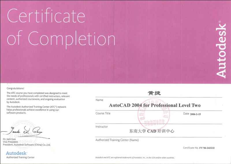 1.東南大學CAD培訓中心取得AutoCAD證書。 2.南京工業職業技術學院機械制造與自動化/電子商務專業證書。 3.西南科技大學土木工程證書。 4.機械工程師證書 5.希望貴公司在蘇州,能提供獨立完成工程的。 |