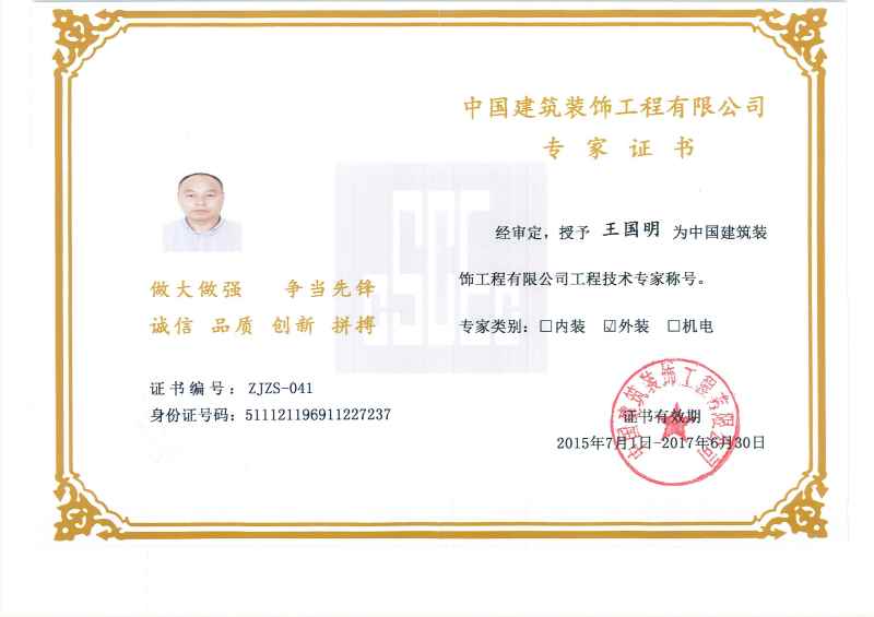 2009年在香港其士集團參加過技術和設計專業培訓。 本人熟悉計算機日常辦公軟件操作,有20年以上施工現場管理工作經驗,工作態度誠懇和嚴謹,積極上進,吃苦耐勞,責任心強,有良好的溝通協調能力;經歷過大型玻璃幕墻、預應力拉索玻璃光棚以及外墻佛碳漆工程。 |