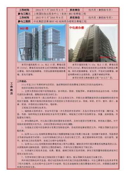 2011年11月至今 就職于 上海迪蒙幕墻工程技術有限公司 工作時間:2011年10月~2012年1月 所在崗位:投標書制作專員(實習) 工作描述: 實習期間主要負責與相關部門的配合,積極協調并解決投標過程中的問題;并在部門領導的帶領下負責完成技術標書及企業資信文件的編制;負責對批準的投標文件按招標文件要求進行排版、打印、復印、裝訂等工作;并按規定如期完成標書制作、簽字蓋章、包裝、密封。在此期間工作認真負責,深受領導和同事的好評,順利轉正。 實習期間多次參加公司組織的施工現場幕墻工程技術知識培訓,在此過程中對幕墻行業有了一個全新的認識,熟悉掌握了建筑幕墻所使用的材料、施工工藝及施工流程,并在同年取得安全員和質量員崗位證書。 工作時間:2012年2月~2013年5月 所在崗位:技術員 參與工程一:上海國際航運服務中心(西塊)15#樓玻璃幕墻工程 工作描述: 本工程建筑中部為連接A、B兩棟樓的中庭,A樓幕墻高度為46.9m,B樓幕墻高度為58.05m,幕墻總面積為18000m2,幕墻系統包括單元式玻璃/陶板組合幕墻、陶板幕墻、鋁板幕墻、構件式明框玻璃幕墻等。 主要負責解決本幕墻工程現場施工難點,參加圖紙會審,對比施工圖與招標圖存在的差異,及時辦理設計變更手續,審核施工圖紙,對于現場安裝難度較大的節點,及時反饋設計師進行深化調整;辦理施工過程中的各種設計變更及現場簽證單,形成具有結算依據的文件,并配合預算員進行價格核算。 工作時間:2013年6月~2014年5月 所在崗位:技術員 參與工程二:軌道交通七號線浦江耀華站(18-1)街坊綜合開發項目幕墻工程 本項目分為南區和北區,南區東樓和西樓由我司施工,其中南區東樓共16層,最高標高為82.510m,幕墻系統包括為單元式石材/玻璃組合幕墻、構件式石材幕墻;南區西樓共22層,最高標高為99.068m,幕墻系統包括構件式石材幕墻和鋁合金窗;南區裙樓共4層,幕墻系統包括構件式開放式石材幕墻、明框玻璃幕墻、玻璃雨棚,幕墻面積共計約48000㎡。 本項目體量較大,工程交復雜,施工過程中主要項目管理人員經過一輪更換,本項目組成員在中途接手本工程,對本項目的施工管理工作大大增加了難度,需在短時間內對整個項目有一個全新的了解,任職期間在主設計師的監督下完成后期的設計變更、拆圖、下料、現場技術指導及竣工圖的編制完善工作,最終按照規定時間順利竣工驗收,并榮獲“上海市明示范工程”的稱號。經歷過本工程高強度的工作,對自己的幕墻專業水平有了質的提升,并在業余時間通過自學,能夠熟練掌握SketchUp三維建模軟件。 工作時間:2014年7月~2015年4月 所在崗位:項目工程師(兼投標專員) 參與工程三:上海國際航運服務中心(東塊)B02樓幕墻工程 本項目建筑高度45.1m,地上10層,幕墻總面積15000m2,幕墻系統包括單元式不銹鋼板/玻璃組合幕墻、構件式玻璃幕墻、雙層全玻璃帶玻璃肋幕墻、采光天窗等。 工作時間:2015年5月~2016年6月 所在崗位:項目工程師(兼投標專員) 參與工程四:中化集團世博B03C-02地塊商辦樓項目幕墻工程 本項目建筑標高74.45m,地上13層,幕墻總面積為25000m2,幕墻系統包括單元式玻璃/石材組合幕墻、構件式玻璃幕墻、采光頂、開放式石材幕墻、鋼結構橫向鋁合金裝飾條、金屬不銹鋼絲網等。本項目獲得上海市建設工程“白玉蘭”獎。 工作描述: 2014年至2016年期間參與的項目,由前期投標階段到幕墻工程竣工階段均全程參與。 投標階段擔任項目投標專員: 1、主要負責投標過程中的現場報名、標書購買、答疑、資格預審、申請投標保證金的辦理、與招標代理的協調溝通、搜集招標信息及時匯總; 2、編制技術標標書(施工組織設計)及企業資信文件,并牽頭協調預算部和設計部編制投標報價和投標方案圖,最終對批準的所有投標文件按招標文件要求進行匯總、排版、審核、打印、復印、裝訂、蓋章、密封,并準時送達現場開標、唱標等。 工程施工階段擔任項目工程師: 1、編制施工組織設計、安全專項方案(并負責組織專家評審)及各分項安全專項方案(腳手架、吊籃、吊裝、臨時用電及各復雜部位安全專項方案等),制定施工過程中的各種安全、質量、成本措施,并監督執行情況; 2、參加圖紙會審,對比施工圖與招標圖存在的差異,及時辦理設計變更手續,審核施工圖紙,對于現場安裝難度較大的節點,及時反饋設計師進行深化調整; 3、辦理施工過程中的各種設計變更及現場簽證單,形成具有結算依據的文件,并配合預算員進行價格核算; 4、運用SketchUp繪制所有幕墻系統三維模型樣板及施工場景三維示意(包括腳手架搭設、吊籃搭設及吊裝設備搭設方式等),以此對現場施工作業人員進行施工工藝、施工措施等技術交底,進行首項、首件、首次施工的示范指導,在施工過程中全程指導; 5、運用SketchUp繪制復雜部位幕墻系統三維節點模型,輔助設計師對復雜幕墻系統更直觀的認識,從而提高單元板塊組裝、型材加工圖的準確性,并參與加工圖繪制及下料工作; 6、負責編寫工程技術總結,收集、整理、編制工程竣工技術資料,參加工程質量等級檢驗評定和工程竣工驗收工作; 7、負責審核竣工圖與施工現場實際工作量的一致性,配合預算員完成竣工決算工作。 工作時間:2016年8月~2017年10月 所在崗位:項目副經理(兼投標專員) 參與工程四:上海國際航運服務中心(中塊)8#樓幕墻工程 本項目為商辦