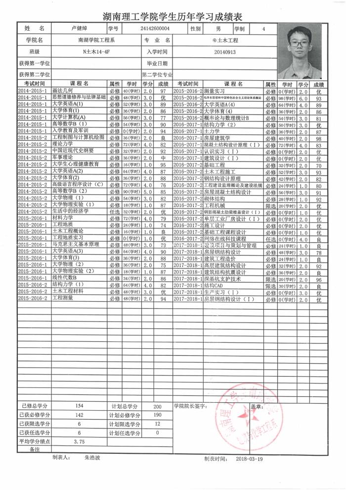 2014.9-2018.6 湖南理工學院南湖學院 土木工程畢業 平均成績績點3.73(GPA:A)年級前三 連續三年獲得國家獎學金 湖南省優秀畢業生 在校期間成績穩定排進年級前十 學生會學習部部長 性格活潑,工作積極,熱愛生活。 |